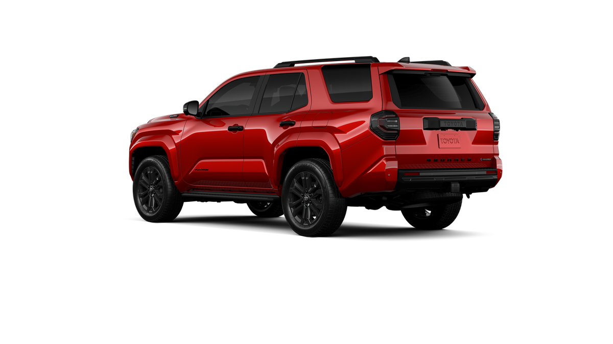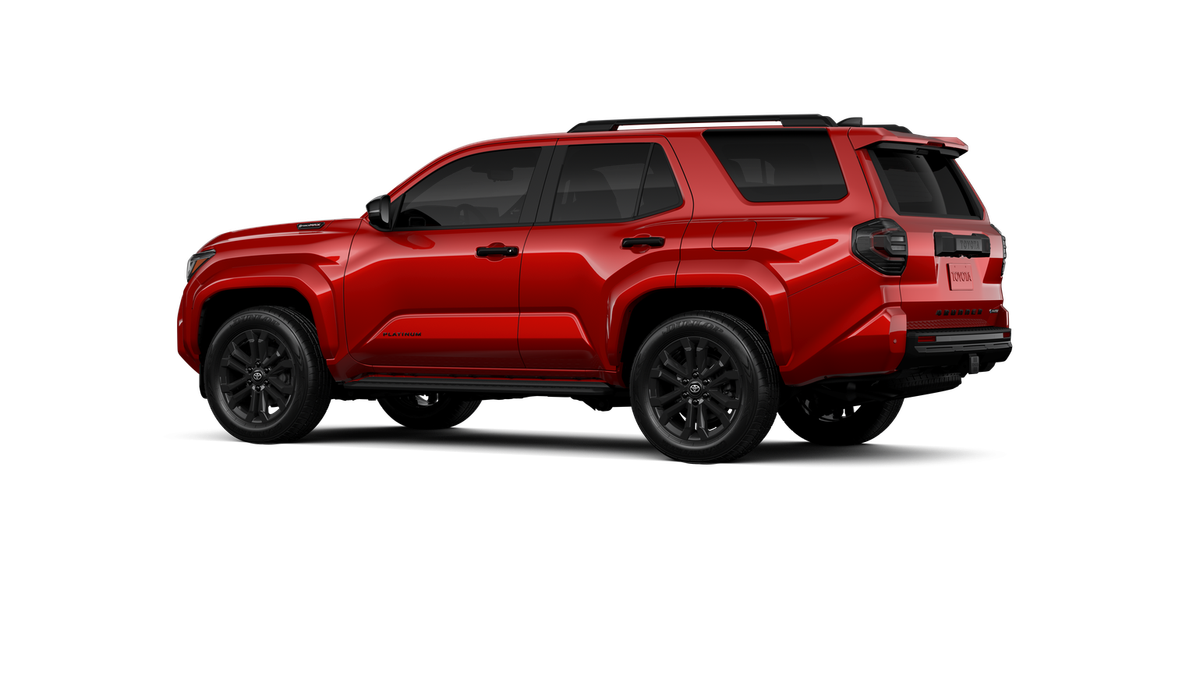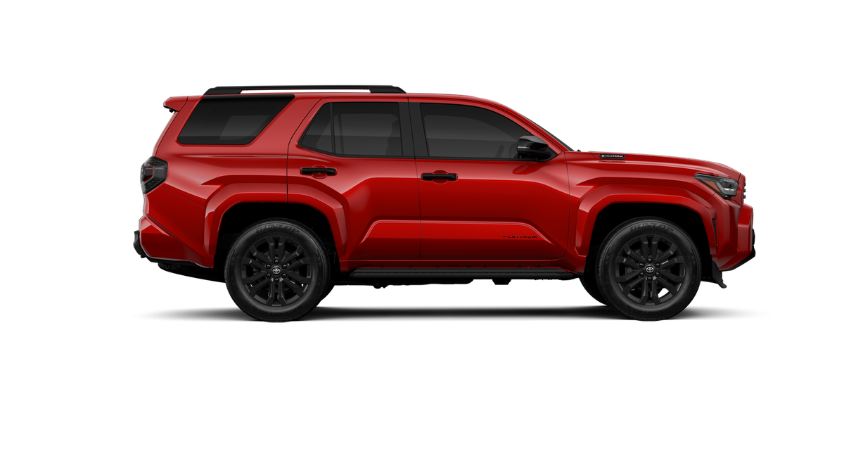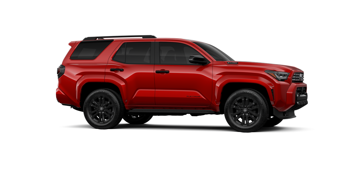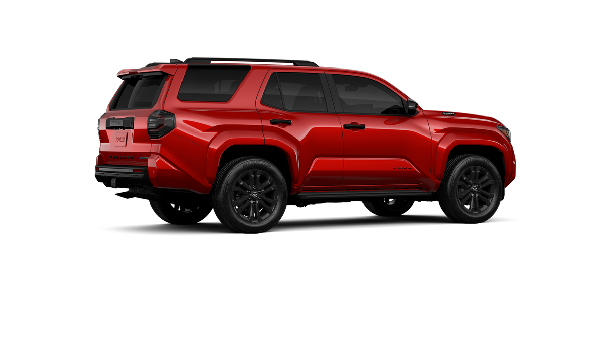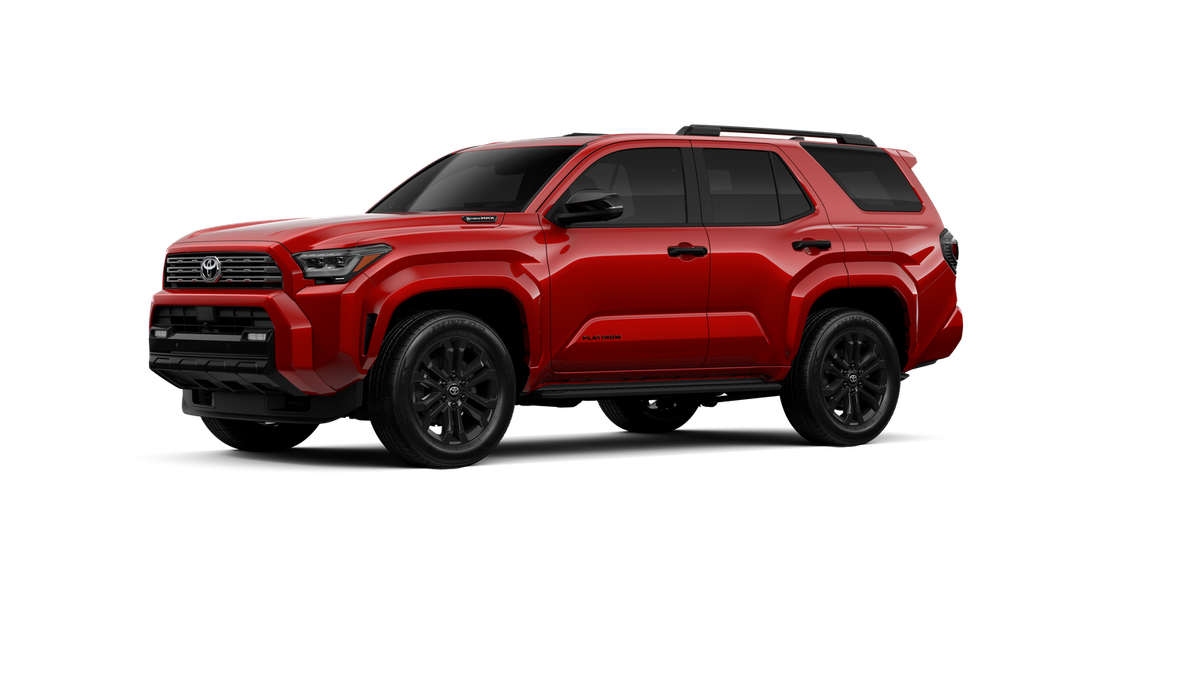 - Dark-chrome tri-bar grille; gloss-black mirror caps and door handles; color-keyed overfenders and rear spoiler; gloss-black "PLATINUM" and "4RUNNER" badges