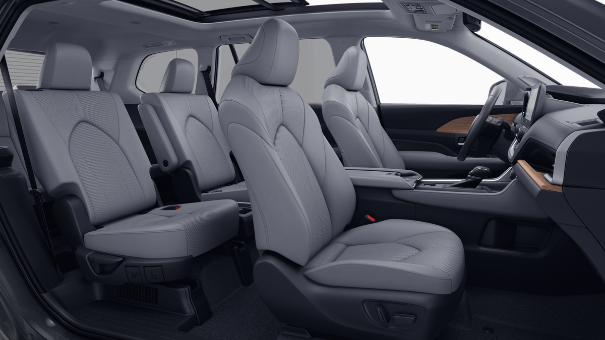 2.5L 4-Cylinder 16V, 11 Speakers, 3rd row seats: split-bench, 4-Wheel Disc Brakes, ABS brakes, Air Conditioning, Alloy wheels, AM/FM radio: SiriusXM, Apple CarPlay/Android Auto, Auto High-beam Headlights, Auto-dimming Rear-View mirror, Automatic temperature control, Brake assist, Bumpers: body-color, Delay-off headlights, Driver door bin, Driver vanity mirror, Dual front impact airbags, Dual front side impact airbags, Electronic Stability Control, Emergency communication system: Safety Connect (up to 10-year trial subscription), Exterior Parking Camera Rear, Four wheel independent suspension, Front anti-roll bar, Front Bucket Seats, Front Center Armrest, Front dual zone A/C, Front fog lights, Front reading lights, Fully automatic headlights, Garage door transmitter: HomeLink, Heated and Ventilated Front Seats, Heated door mirrors, Heated front seats, Heated rear seats, Heated steering wheel, Illuminated Cargo Sill, Illuminated entry, Knee airbag, Leather Seat Trim, Leather Shift Knob, Leather steering wheel, Low tire pressure warning, Memory seat, Mudguards, Navigation system: Drive Connect Cloud Navigation (1-year trial subscription), Occupant sensing airbag, Outside temperature display, Overhead airbag, Overhead console, Panic alarm, Panoramic View Monitor, Passenger door bin, Passenger vanity mirror, Power door mirrors, Power driver seat, Power Liftgate, Power passenger seat, Power steering, Power Tilt/Slide Panoramic Rood with Power Sunshade, Power windows, Premium Paint, Radio: 12.3 Toyota Audio Multimedia with JBL Audio, Rain sensing wipers, Rear air conditioning, Rear anti-roll bar, Rear Hatch Cargo Lamps, Rear reading lights, Rear window defroster, Rear window wiper, Reclining 3rd row seat, Remote keyless entry, Security system, Speed control, Speed-sensing steering, Split folding rear seat, Spoiler, Steering wheel mounted audio controls, Telescoping steering wheel, Tilt steering wheel, Traction control, Trip computer, Turn signal indicator mirrors, Variably intermittent wipers, Ventilated front seats, and Wheels: 20 Silver Multi-Spoke Aluminum. 2.5L 4-Cylinder 16V.