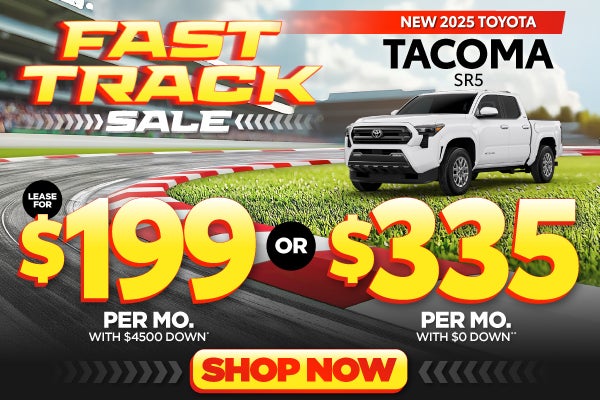 Plus tax, tag, title, $1,299 dealer fee, $585 electronic fee (these charges represent costs and profit to the dealer for items such as inspecting, cleaning, and adjusting vehicles, and preparing documents related to the sale or lease), acquisition fee and inception charges. *New 2025 Toyota Tacoma 4x2 SR5 DoubleCab, Model 7146. Lease for $199 per month for 39 months, 12,000 miles per year with $4,500 due at signing. Lease Selling Price $35,385.00. No Security Deposit Required. Payments with approved credit through dealer approved lender. ** New 2025 Toyota Tacoma 4x2 SR5 DoubleCab, Model 7146. Lease for $335 per month for 39 months, 12,000 miles per year with $0 due at signing, not including first payment. Lease Selling Price $35,385.00. No Security Deposit Required. Payments with approved credit through dealer approved lender. Lessee responsible for maintenance, repairs, excessive wear and tear, and excess mileage over 12000 miles/year at the rate of $0.15/mile. See dealer for complete details. Prior sales are excluded. Image used for illustration purposes only. Offer expires 3/2/26.