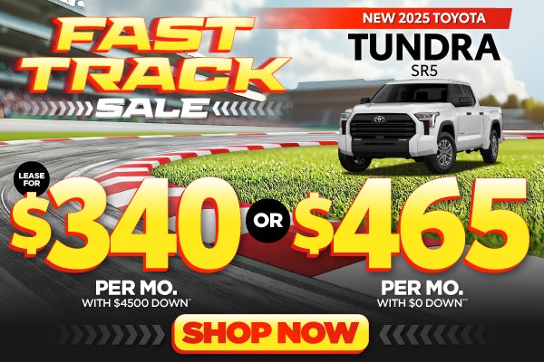 Plus tax, tag, title, $1,299 dealer fee, $585 electronic fee (these charges represent costs and profit to the dealer for items such as inspecting, cleaning, and adjusting vehicles, and preparing documents related to the sale or lease), acquisition fee and inception charges. *New 2025 Toyota Tundra SR5 Crewmax, Model 8361. Lease for $340 per month for 39 months, 12,000 miles per year with $4,500 due at signing. Lease Selling Price $43,434.00. No Security Deposit Required. Payments with approved credit through dealer approved lender. **New 2025 Toyota Tundra SR5 Crewmax, Model 8361. Lease for $465 per month for 39 months, 12,000 miles per year with $0 due at signing, not including first payment. Lease Selling Price $43,434.00. No Security Deposit Required. Payments with approved credit through dealer approved lender. Lessee responsible for maintenance, repairs, excessive wear and tear, and excess mileage over 12000 miles/year at the rate of $0.15/mile. See dealer for complete details. Prior sales are excluded. Image used for illustration purposes only. Offer expires 3/2/26.