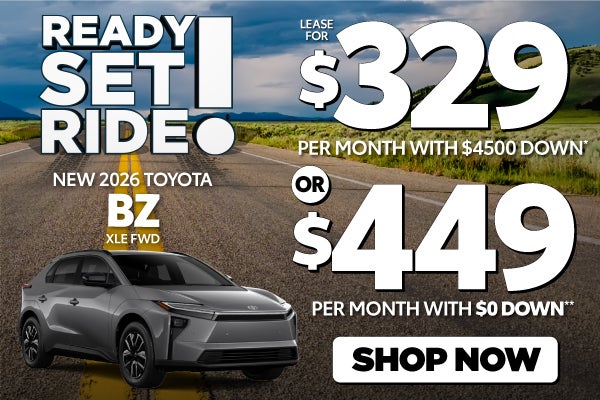 Plus tax, tag, title, $1,299 dealer fee, $585 electronic fee (these charges represent costs and profit to the dealer for items such as inspecting, cleaning, and adjusting vehicles, and preparing documents related to the sale or lease), acquisition fee and inception charges. *New 2026 Toyota BZ XLE, Model 2870. Lease for $329 per month for 36 months, 12,000 miles per year with $4,500 due at signing. Lease Selling Price $39,000.00. No Security Deposit Required. Payments with approved credit through dealer approved lender. **New 2026 Toyota BZ XLE, Model 2870. Lease for $449 per month for 36 months, 12,000 miles per year with $0 due at signing, not including first payment. Lease Selling Price $39,000.00. No Security Deposit Required. Payments with approved credit through dealer approved lender. Lessee responsible for maintenance, repairs, excessive wear and tear, and excess mileage over 12000 miles/year at the rate of $0.15/mile. See dealer for complete details. Prior sales are excluded. Image used for illustration purposes only. Offer expires 5/4/26.