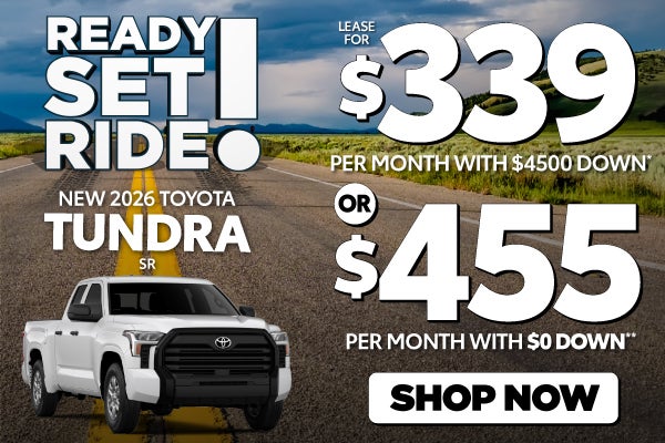 Plus tax, tag, title, $1,299 dealer fee, $585 electronic fee (these charges represent costs and profit to the dealer for items such as inspecting, cleaning, and adjusting vehicles, and preparing documents related to the sale or lease), acquisition fee and inception charges. *New 2026 Toyota Tundra 4x2 SR Crewmax, Model 8248. Lease for $339 per month for 36 months, 12,000 miles per year with $4,500 due at signing. Lease Selling Price $48,720.00. No Security Deposit Required. Payments with approved credit through dealer approved lender. **New 2026 Toyota Tundra 4x2 SR Crewmax, Model 8248. Lease for $455 per month for 36 months, 12,000 miles per year with $0 due at signing, not including first payment. Lease Selling Price $48,720.00. No Security Deposit Required. Payments with approved credit through dealer approved lender. Lessee responsible for maintenance, repairs, excessive wear and tear, and excess mileage over 12000 miles/year at the rate of $0.15/mile. See dealer for complete details. Prior sales are excluded. Image used for illustration purposes only. Offer expires 5/4/26.