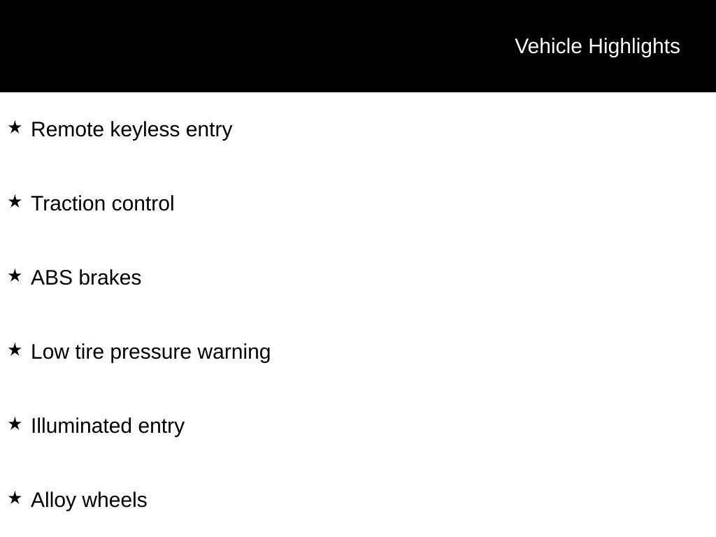 1.5L I4 SMPI DOHC, ABS brakes, Alloy wheels, Illuminated entry, Low tire pressure warning, Remote keyless entry, Traction control.