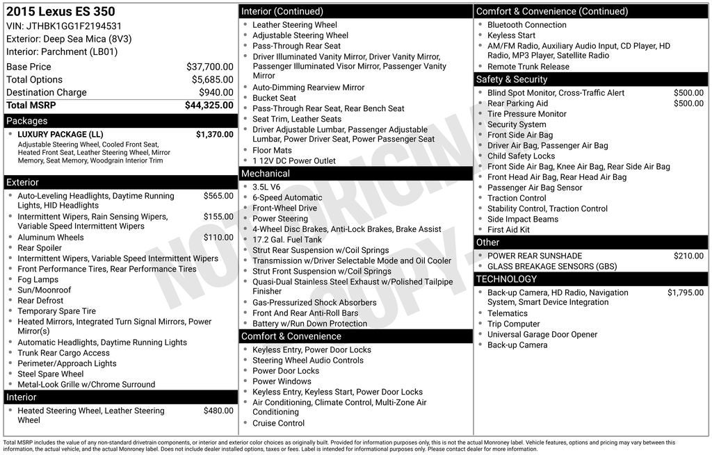 - Vehicle Name: Lexus ES 350