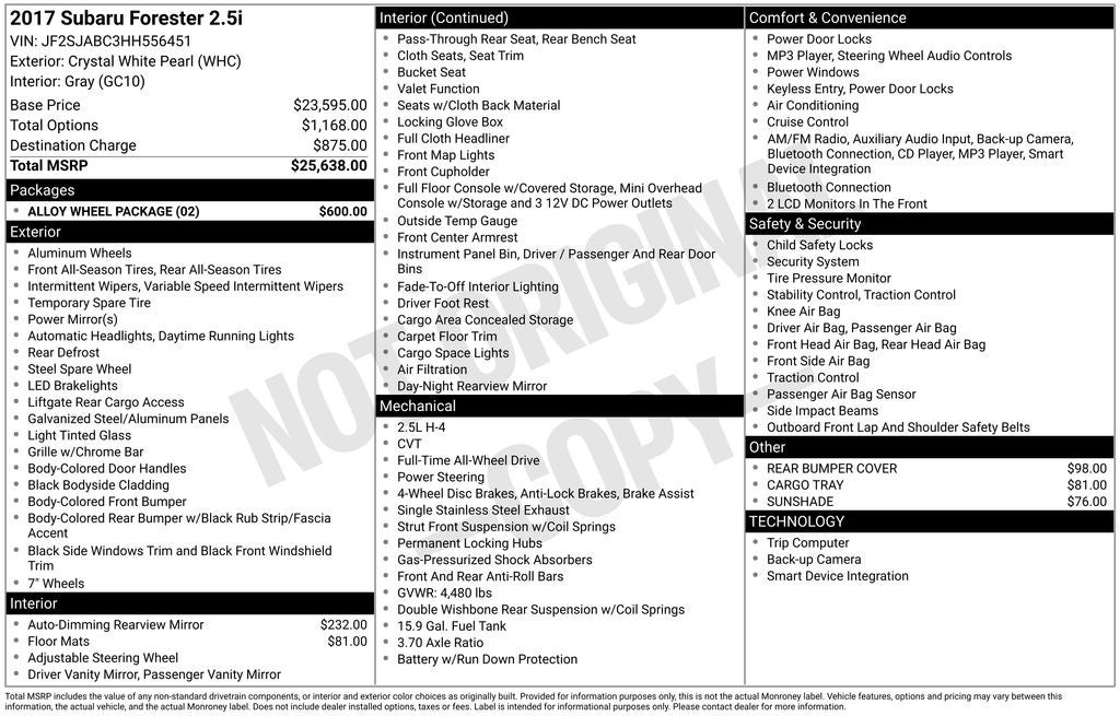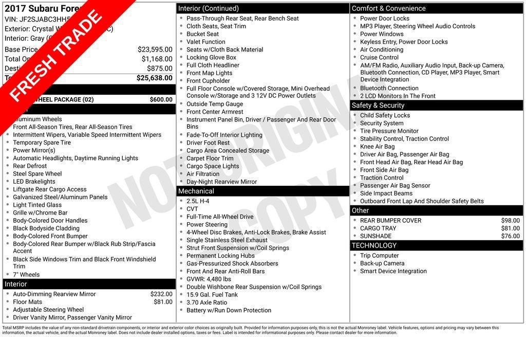 *Prices are PLUS tax, tag, title fee, $1,299 Pre-Delivery Service Fee** and $585 Electronic Tag Registration Service Fee** and dealer installed options (see dealer for details). A copy of the advertisement must be presented at time of purchase to receive any special or advertised price. Prior sales are excluded. We attempt to update this inventory regularly; however, there can be lag time between the sale of a vehicle and the updating of inventory. Vehicle information is based off standard equipment and may vary from vehicle to vehicle. Call or email for complete vehicle information. All specifications, prices and equipment are subject to change without notice. ** Fees/charges represents costs and profit to the dealer for items such as inspecting, cleaning, and adjusting vehicles, and preparing documents related to the sale.