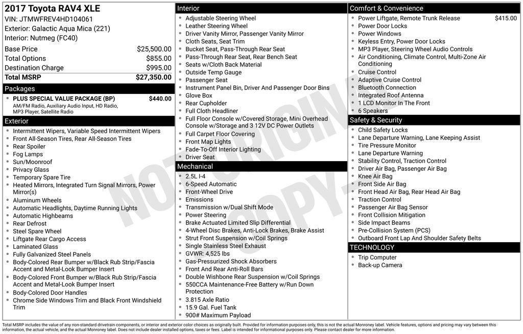 "Plus" Special Value Package Roof Rails, and Entune Audio Plus with Connected Navigation - Includes the Entune Multimedia Bundle (6.1 In. High Resolution Touch-Screen Display, AM/FM CD Player, MP3/WMA Playback Capability, 6 Speakers, Auxiliary Audio Jack, USB 2.0 Port With iPod Connectivity and Control, Advanced Voice Recognition, Hands-Free Phone Capability, Phone Book Access And Music Streaming Via BluetoothĀ® Wireless Technology), Scout GPS Link, Siri Eyes Free, SiriusXM Satellite Radio with 3-Month Complimentary Sirius XM All Access Trial, HD Radio, and HD Radio Traffic and Weather In Major Metro Areas. Special Value Package MSRP Discount Shown Below. ($0)