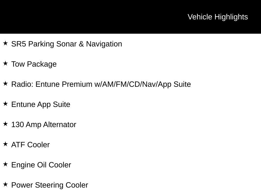 SR5 Parking Sonar & Navigation (V6 Only): Includes Entune Premiuim Audio w/ Navigation & Rear Parking Sonar ($0)