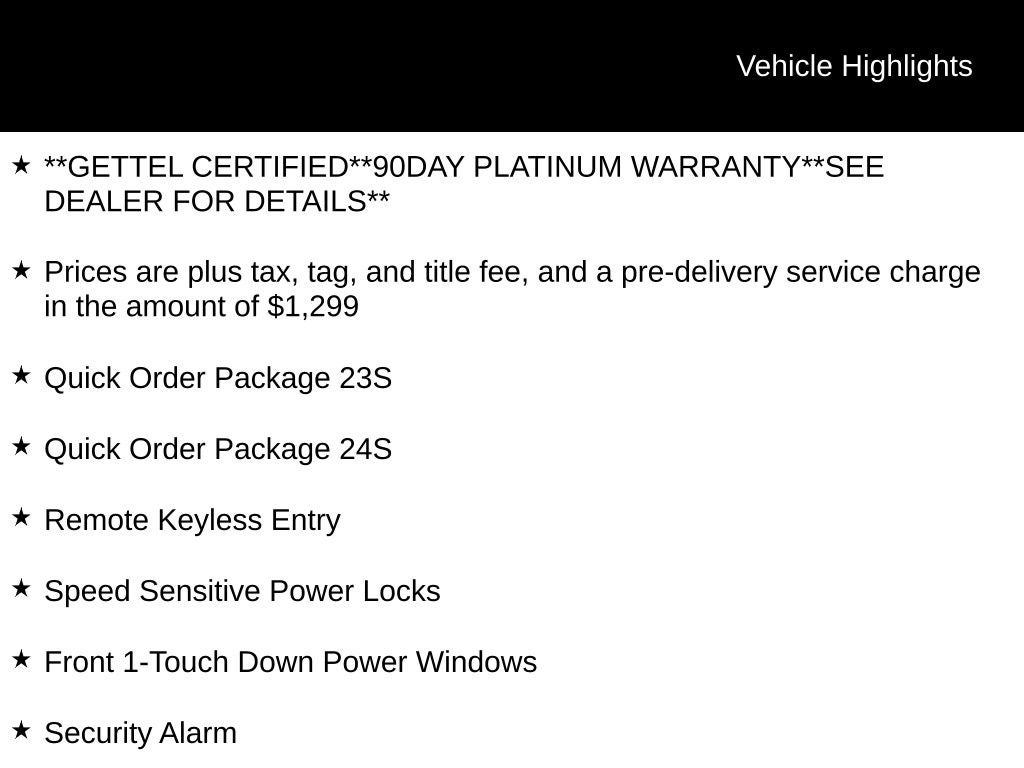 *Prices are PLUS tax, tag, title fee, $1,299 Pre-Delivery Service Fee** and $585 Electronic Tag Registration Service Fee** and dealer installed options (see dealer for details). A copy of the advertisement must be presented at time of purchase to receive any special or advertised price. Prior sales are excluded. We attempt to update this inventory regularly; however, there can be lag time between the sale of a vehicle and the updating of inventory. Vehicle information is based off standard equipment and may vary from vehicle to vehicle. Call or email for complete vehicle information. All specifications, prices and equipment are subject to change without notice. ** Fees/charges represents costs and profit to the dealer for items such as inspecting, cleaning, and adjusting vehicles, and preparing documents related to the sale.