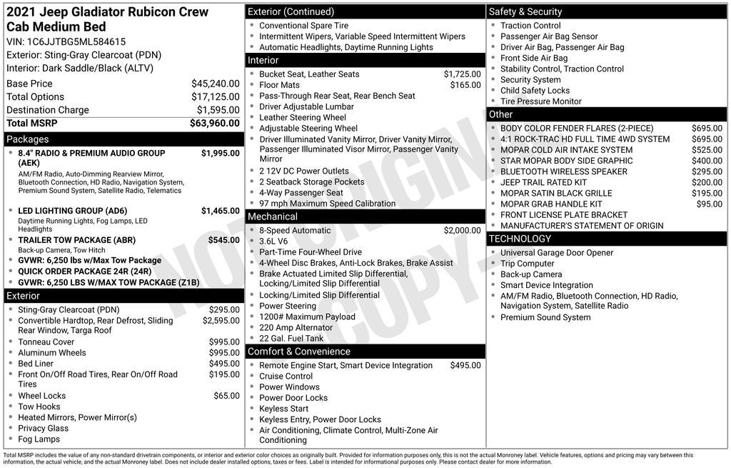 *Prices are PLUS tax, tag, title fee, $1,299 Pre-Delivery Service Fee** and $585 Electronic Tag Registration Service Fee** and dealer installed options (see dealer for details). A copy of the advertisement must be presented at time of purchase to receive any special or advertised price. Prior sales are excluded. We attempt to update this inventory regularly; however, there can be lag time between the sale of a vehicle and the updating of inventory. Vehicle information is based off standard equipment and may vary from vehicle to vehicle. Call or email for complete vehicle information. All specifications, prices and equipment are subject to change without notice. ** Fees/charges represents costs and profit to the dealer for items such as inspecting, cleaning, and adjusting vehicles, and preparing documents related to the sale.