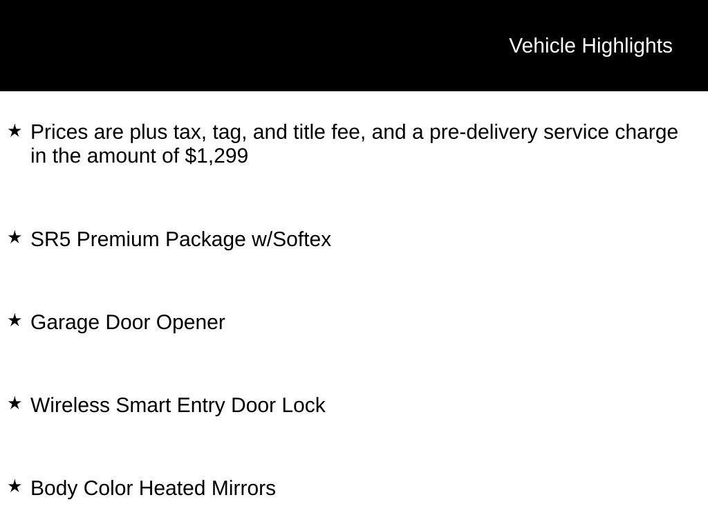 - Prices are plus tax, tag, and title fee, and a pre-delivery service charge in the amount of $1,299
