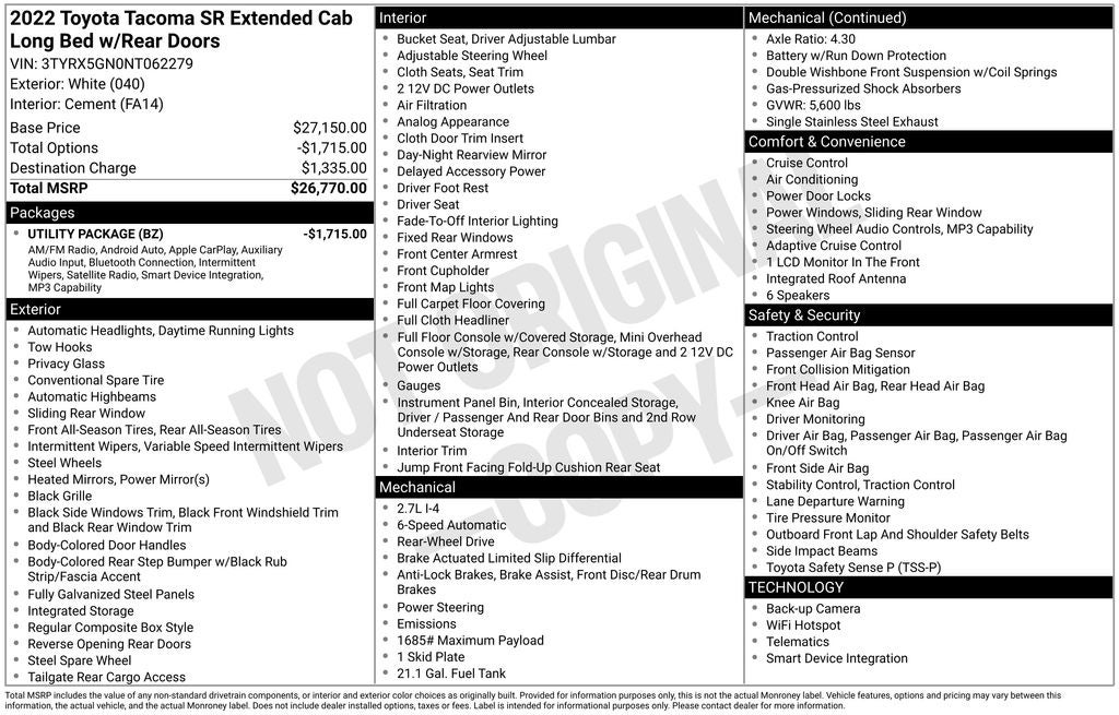 - Vehicle Name: Toyota Tacoma 2WD
