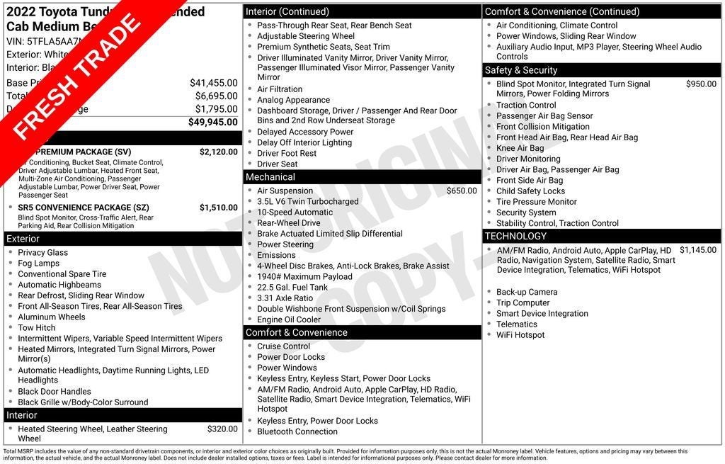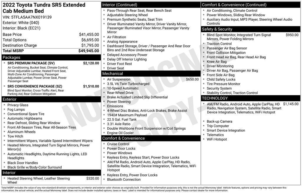 SR5 Convenience Package - Includes Blind Spot Monitor (BSM), Front and Rear Parking Assist with Automated Braking, and large fuel tank (32.2 gallons) ($0)