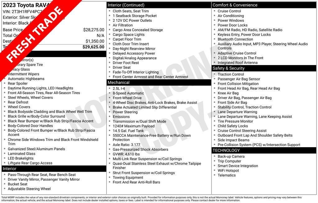 *Prices are PLUS tax, tag, title fee, $1,299 Pre-Delivery Service Fee** and $585 Electronic Tag Registration Service Fee** and dealer installed options (see dealer for details). A copy of the advertisement must be presented at time of purchase to receive any special or advertised price. Prior sales are excluded. We attempt to update this inventory regularly; however, there can be lag time between the sale of a vehicle and the updating of inventory. Vehicle information is based off standard equipment and may vary from vehicle to vehicle. Call or email for complete vehicle information. All specifications, prices and equipment are subject to change without notice. ** Fees/charges represents costs and profit to the dealer for items such as inspecting, cleaning, and adjusting vehicles, and preparing documents related to the sale.