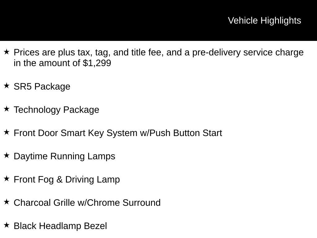 - Prices are plus tax, tag, and title fee, and a pre-delivery service charge in the amount of $1,299