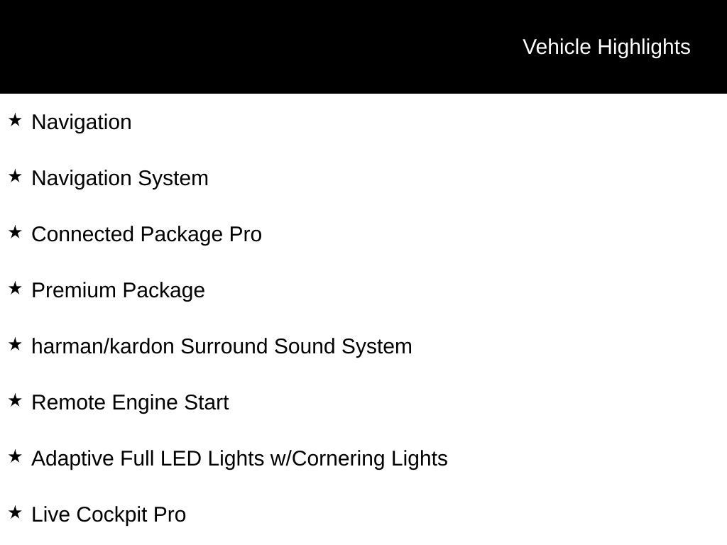 - Premium Package (Remote Engine Start, Gesture Control, Adaptive Full LED Lights, Live Cockpit Pro, HUD and video AR, harman/kardon Surround Sound System)