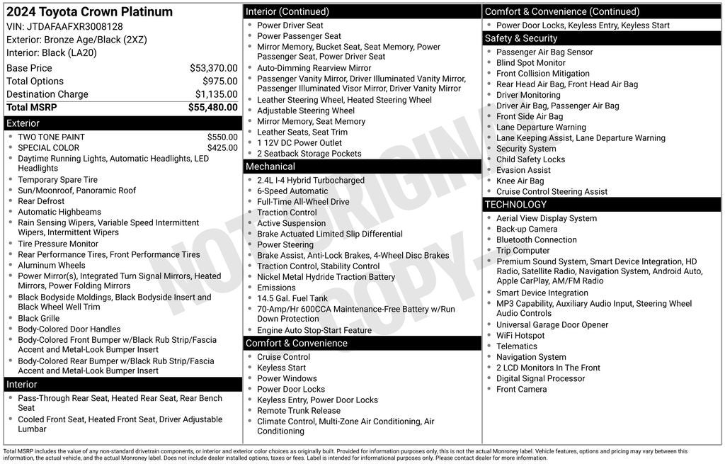 Discover the pinnacle of refined luxury and advanced technology in the 2024 Toyota Crown Platinum. This exceptional vehicle is a true masterpiece, blending unparalleled craftsmanship with cutting-edge features to elevate your driving experience.Meticulously designed, the 2024 Toyota Crown Platinum boasts a stunning exterior with a special two-tone paint scheme that exudes elegance and sophistication. Step inside and you'll be enveloped in a world of comfort and convenience, with a host of premium amenities that cater to your every need:- Dynamic Navigation with a 3-year trial- 11-speaker JBL premium audio system- Heated and ventilated front seats- Heated steering wheel- Leather-wrapped shift knob and steering wheel- Adaptive suspension for a smooth, responsive ridePowered by a robust 2.4L 4-cylinder engine paired with a 6-speed automatic transmission and all-wheel drive, the 2024 Crown Platinum delivers an exceptional blend of performance and efficiency, with an EPA-estimated 29 city/32 highway MPG.This Toyota Crown Platinum is a Toyota Certified Used Vehicle (TCUV), meaning it has undergone a rigorous 160-point inspection and comes with a comprehensive warranty package to give you peace of mind. Enjoy the benefits of:- 160-Point Inspection- Roadside Assistance- $0 Warranty Deductible- Transferable Warranty- 12-Month/12,000-Mile Limited Comprehensive Warranty- 84-Month/100,000-Mile Powertrain Limited Warranty- Roadside Assistance for 7 Years/100,000 MilesStandard new-car financing rates are available, and your transaction will be handled with the utmost care, including all DMV paperwork. We welcome the opportunity to demonstrate the exceptional quality and value of this 2024 Toyota Crown Platinum. Visit our showroom today and experience the pinnacle of luxury and technology.