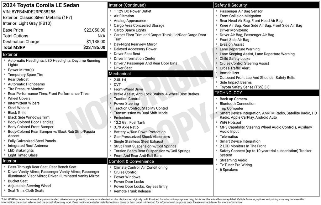 Safety is a top priority, and this Corolla LE delivers with a comprehensive suite of advanced safety technologies. Enjoy the peace of mind of features like the Exterior Parking Camera Rear, dual front side impact airbags, and traction control, all working together to help protect you and your passengers.
