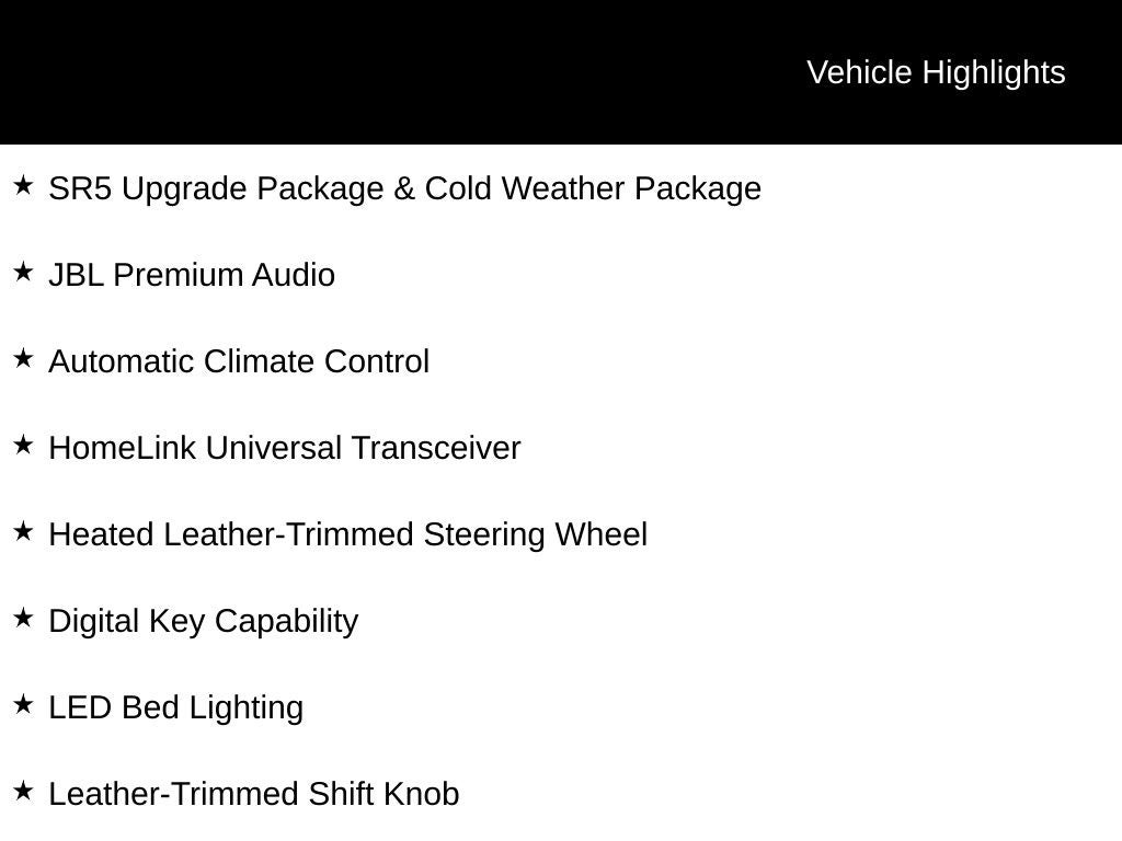 SR5 Upgrade + Cold Weather Package (Double Cab) - includes heated front seats, leather-trimmed heated steering wheel, JBL(R) Premium Audio with JBL(R) FLEX portable speaker, Integrated Trailer Brake Controller (ITBC), and power horizontal rear window